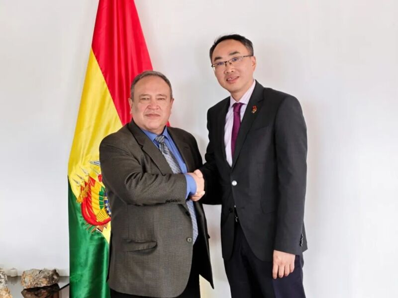 2月11日,驻玻利维亚大使王亮拜会玻新任矿业与冶金部长卡尔德隆,就加强两国矿产领域务实合作等议题深入交换意见,玻矿业政策副部长兰迪瓦尔、使馆负责经济事务参赞刘晓峰等参加。