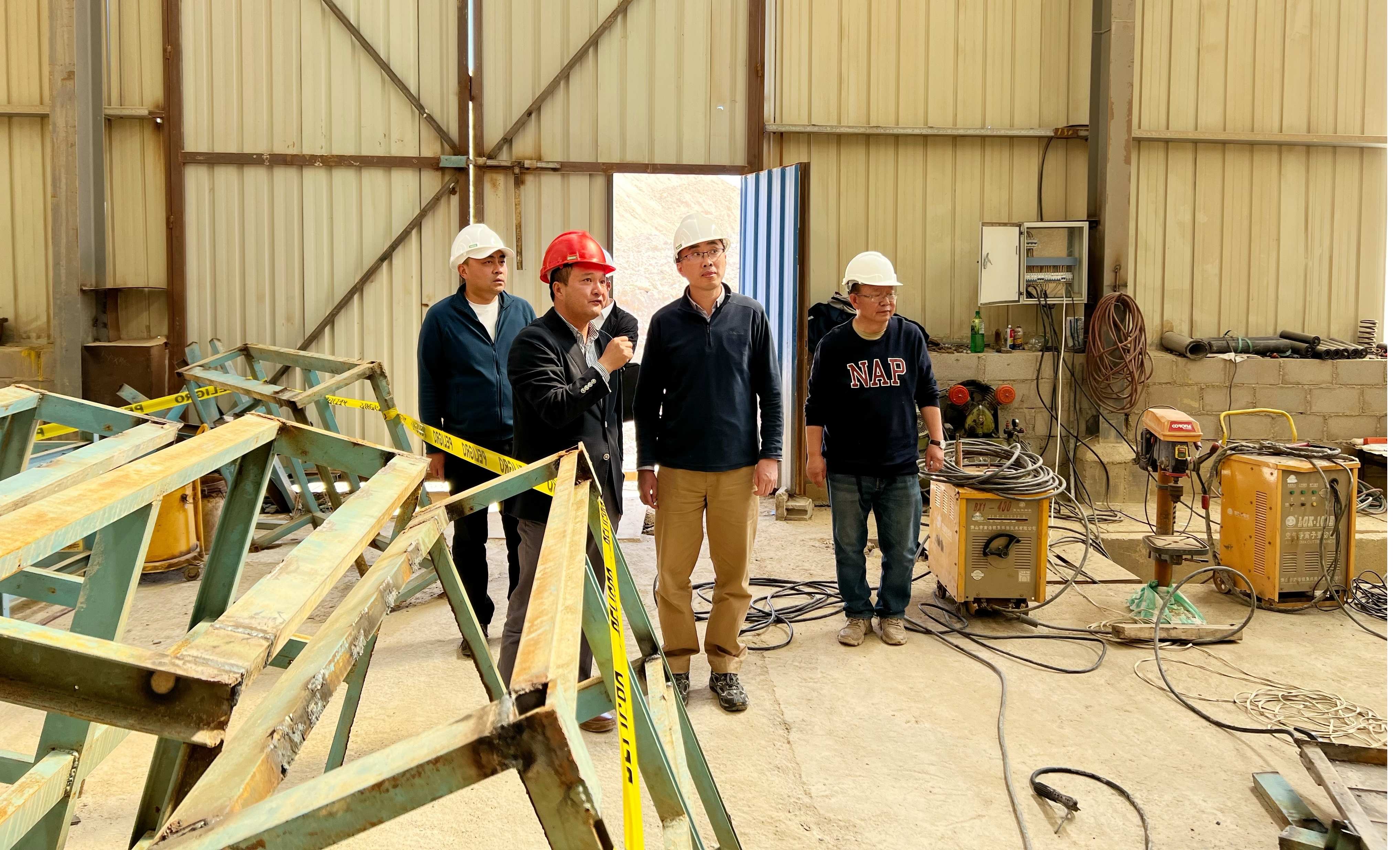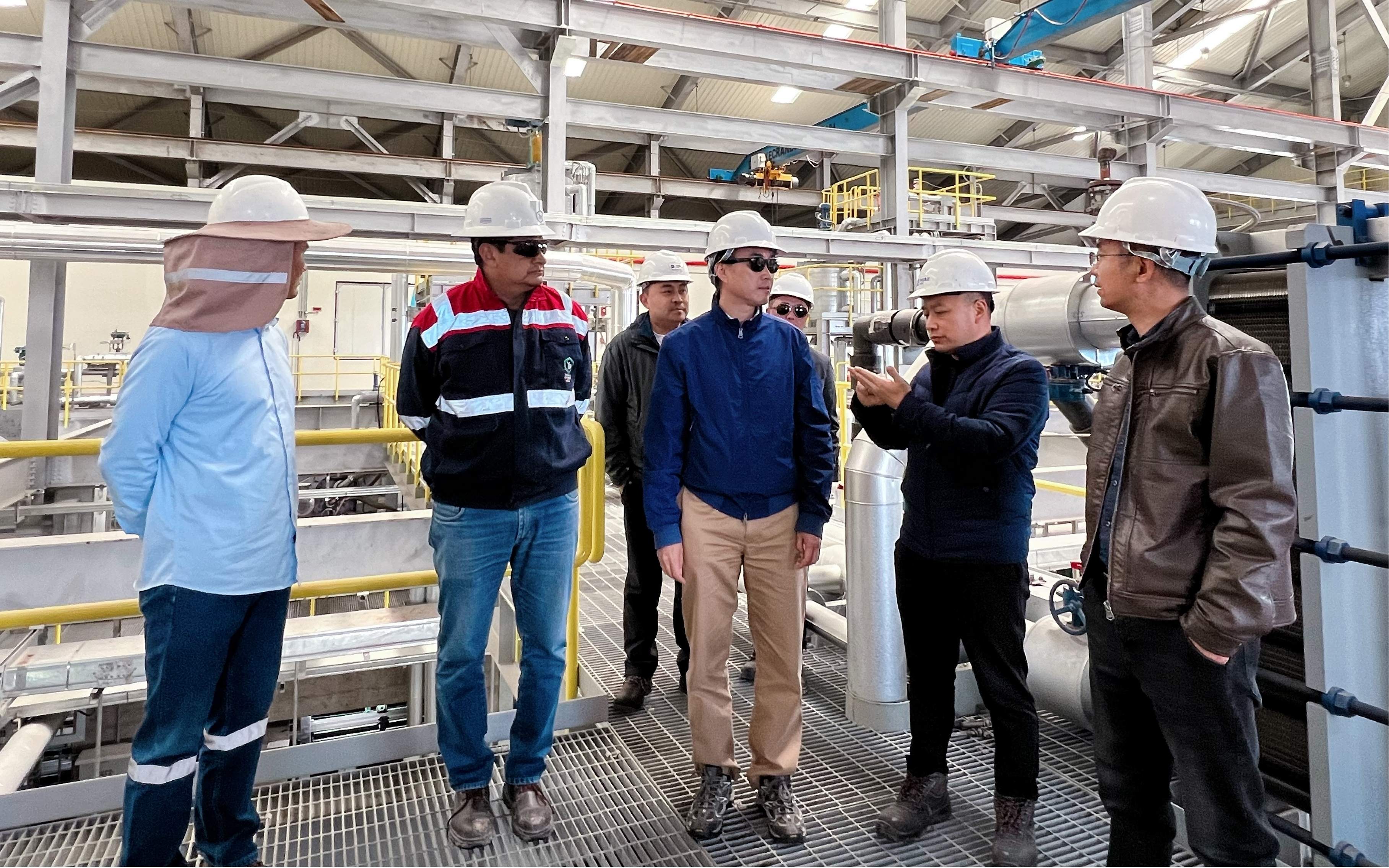 王亮大使现场考察中机设备公司(CMEC)承建的乌尤尼碳酸锂工厂项目,听取项目部负责人工作汇报,并与玻国家锂业公司(YLB)代表进行交流。